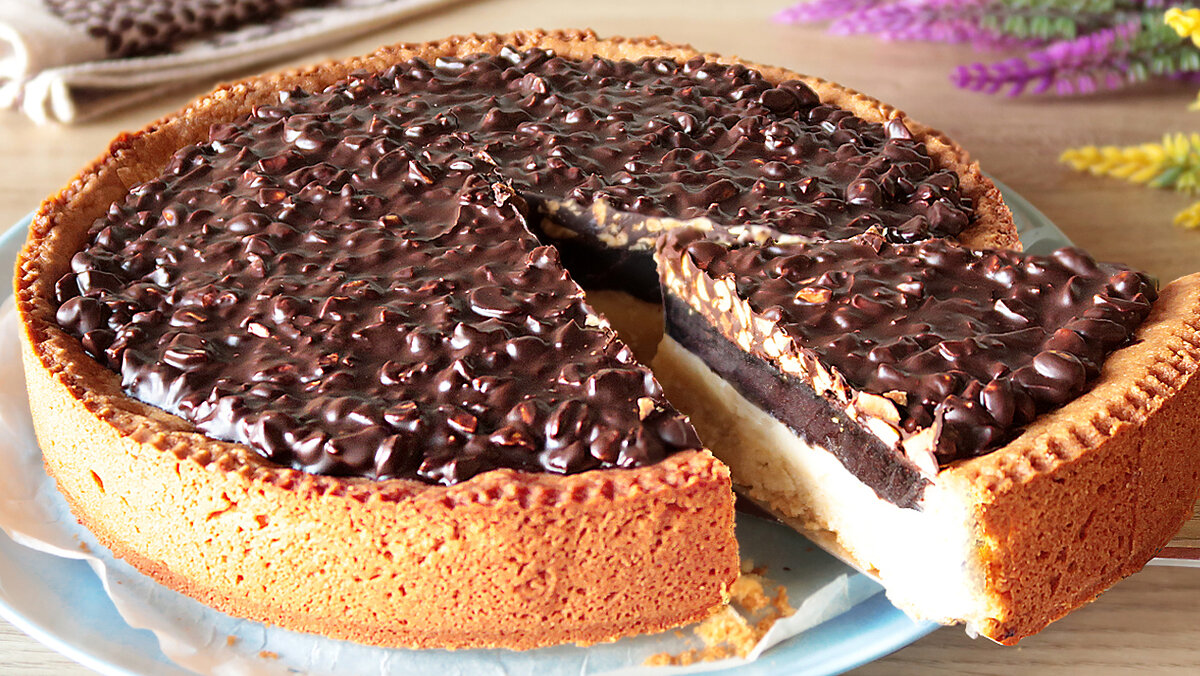 Привет друзья! Сегодня поделюсь рецептом очень вкусного пирога. В нем два вида теста, обычное песочное, шоколадное, а также прослойка из заварного крема! Сверху я украсила пирог глазурью из шоколада и орехов. Способ приготовления: Готовлю тесто: разбиваю в тарелку яйцо, высыпаю сахарную пудру или мелкий сахар Хорошо перемешиваю Высыпаю в миску муку и добавляю разрыхлитель. Перемешиваю венчиком Добавляю холодное сливочное масло, порезанное на небольшие кусочки Перемешиваю руками масло с мукой в мелкую в крошку Делаю небольшую ямку и выливаю яичную смесь Замешиваю руками мягкое тесто. Долго вымешивать не надо, как только тесто собирается в комок - оно готово Заворачиваю тесто пищевую пленку и убираю в холодильник Готовлю заварной крем: в миску добавляю два желтка или одно яйцо, всыпаю ванильный сахар, соль, обычный сахар и крахмал Перемешиваю продукты венчиком. Понемногу добавляю сливки Все хорошо перемешиваю чтобы не осталось комочков, ставлю смесь нагреваться Варю ее варю её до загу