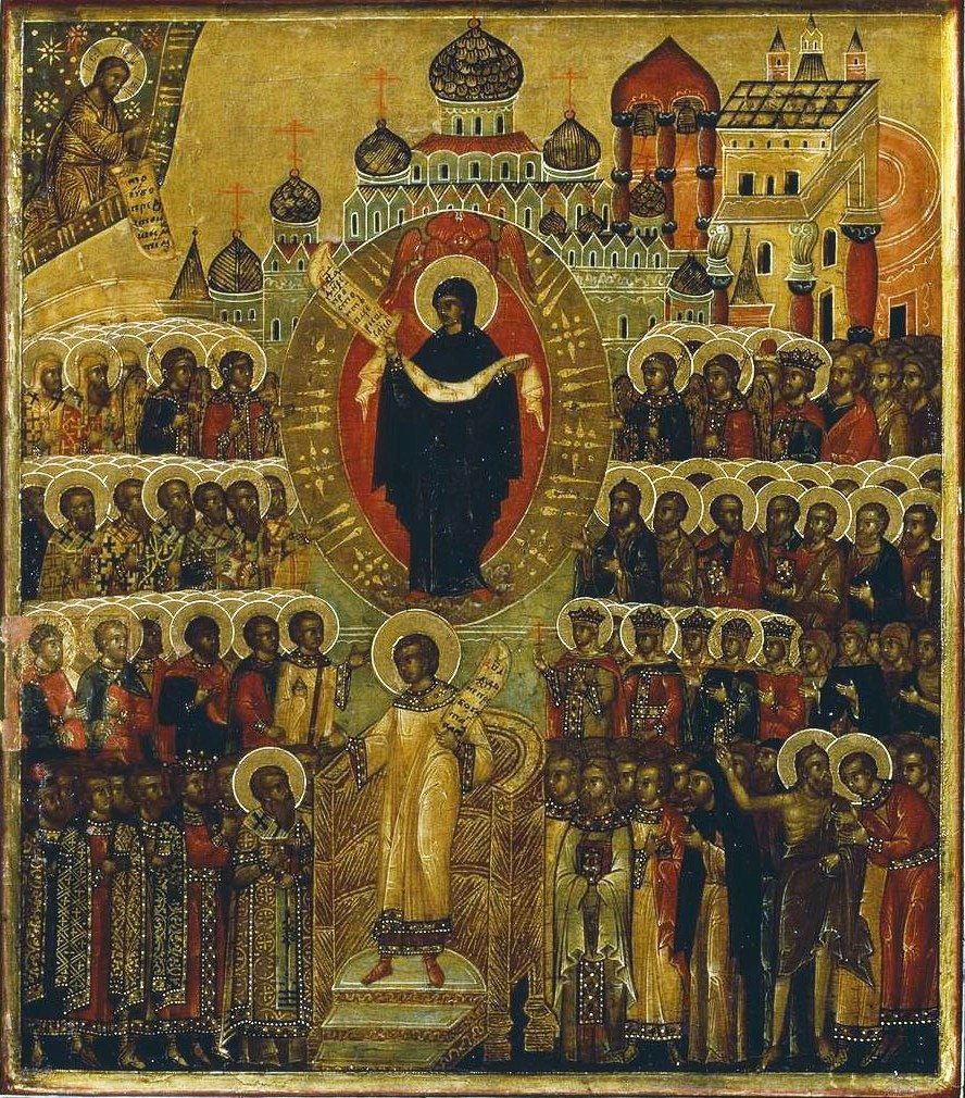 По преданию, Богородица явилась молящимся во Влахернском храме в Константинополе. Произошло это в 910 году. К Константинополю подступили войска варваров. Священники города молились об избавлении от врагов, и вот в четвертом часу ночи будущему известному христианскому святому, юродивому Андрею Константинопольскому (славянину, попавшему некогда в византийский плен), во Влахернском храме Константинополя явилось видение. На небе он увидел идущую по воздуху Богородицу, озарённую небесным светом, окруженную ангелами и сонмом святых. Как описывает это видение святой Димитрий Ростовский, Богородица «сняла с Себя блиставшее наподобие молн