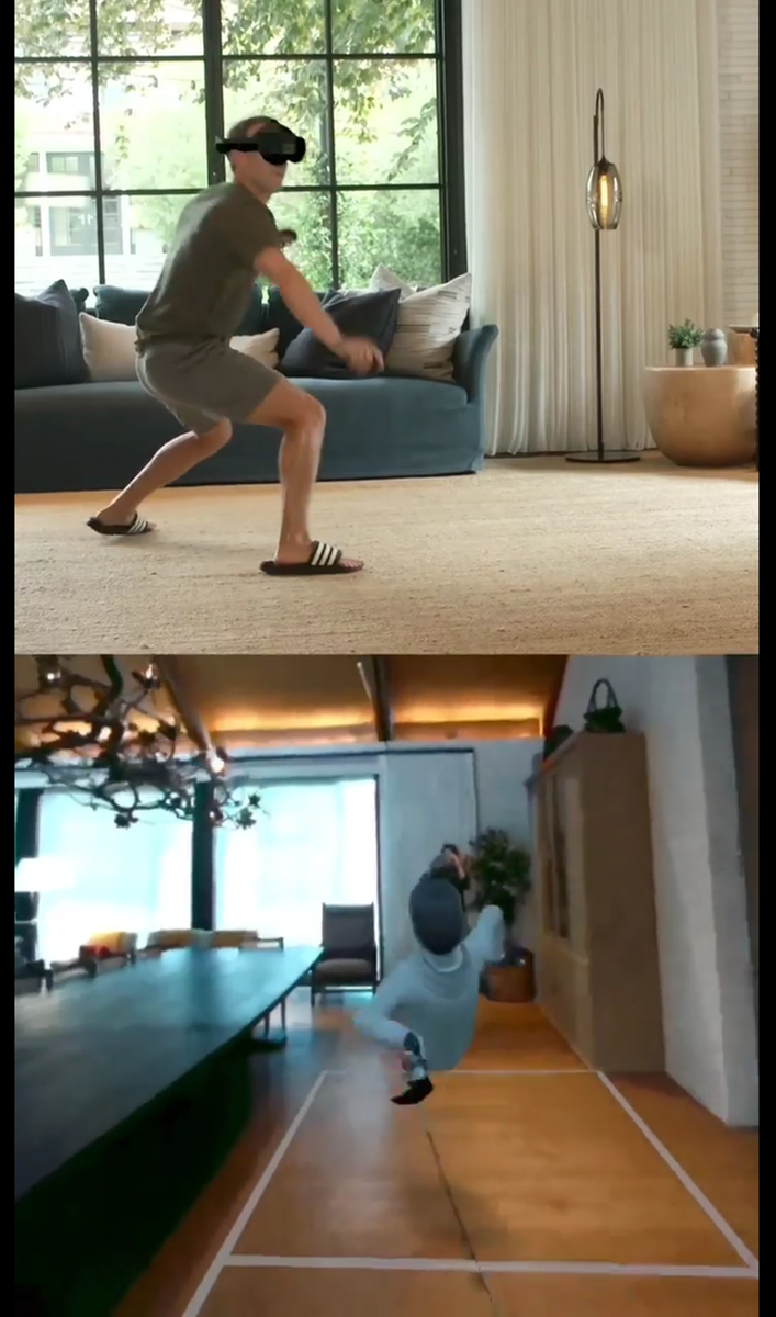 Вот интересный кейс того как крупная IT кампания, изначально сфокусировавшаяся на VR (виртуальная реальность) и даже сделавшая его основной своей долгосрочной стратегии, постепенно превращает его в Mixed Reality. Особенно когда речь доходит до обучения. На скриншоте выше (а также есть полное видео) некто Марк Цукерберг фехтует у себя дома с олимпийскими чемпионами, а точнее их аватарами. На нем надеты очки виртуальной реальности, то есть он не видит окружения, но на экране ему транслируется именно собственная комната.