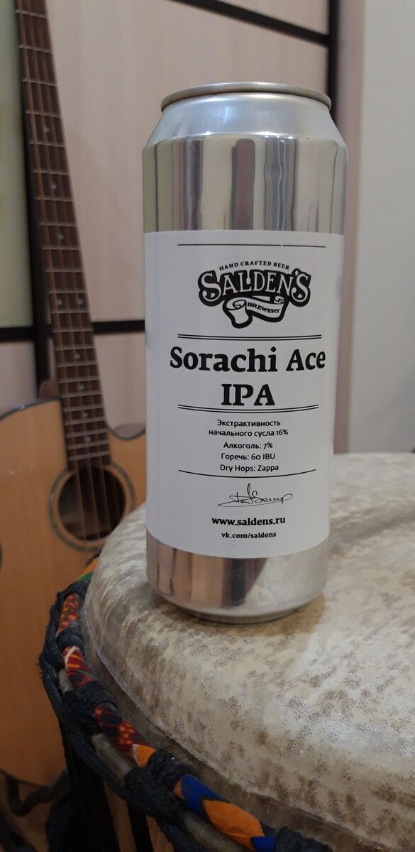 Был прихвачен в магазине вместе с Заппой, и, если последний мне давно знаком, то хмель Сорачи Эйс для меня в новинку - довольно интересно, какой вкус он придаст ипе, тем более, что ипы от Салденса довольно типичны и похожи друг на друга. Пиво светлое нефильтрованное неосветлённое непастеризованное "Салденс Американ Ипа", ООО "Добрый Хмель", Тула. Состав: вода, солод пивоваренный, хмель, дрожжи. ТТХ: алкоголь 7%, плотность 16, уровень горечи 60, рейтинг на "тапке" 3.79. Стиль: AIPA. Хмель: на банке указано "заппа", но это явная ошибка - хмель сорачи эйс. Беглый гуглинг говорит нам, что этот хмель был выведен в Японии в 1984 году в попытках повторить хмель Сааз, но с большим содержанием альфа-кислот. Что ж, посмотрим, что за зверь таится в банке, вскрываем! Пиво светло-янтарного цвета, почти прозрачное, без взвеси и осадка, с шикарной мелкопузырчатой пенной шапкой, которая медленно оседает в бокале. Аромат не балует насыщенностью и силой: немного цитрусов и специй. А вот вкус наоборот, о