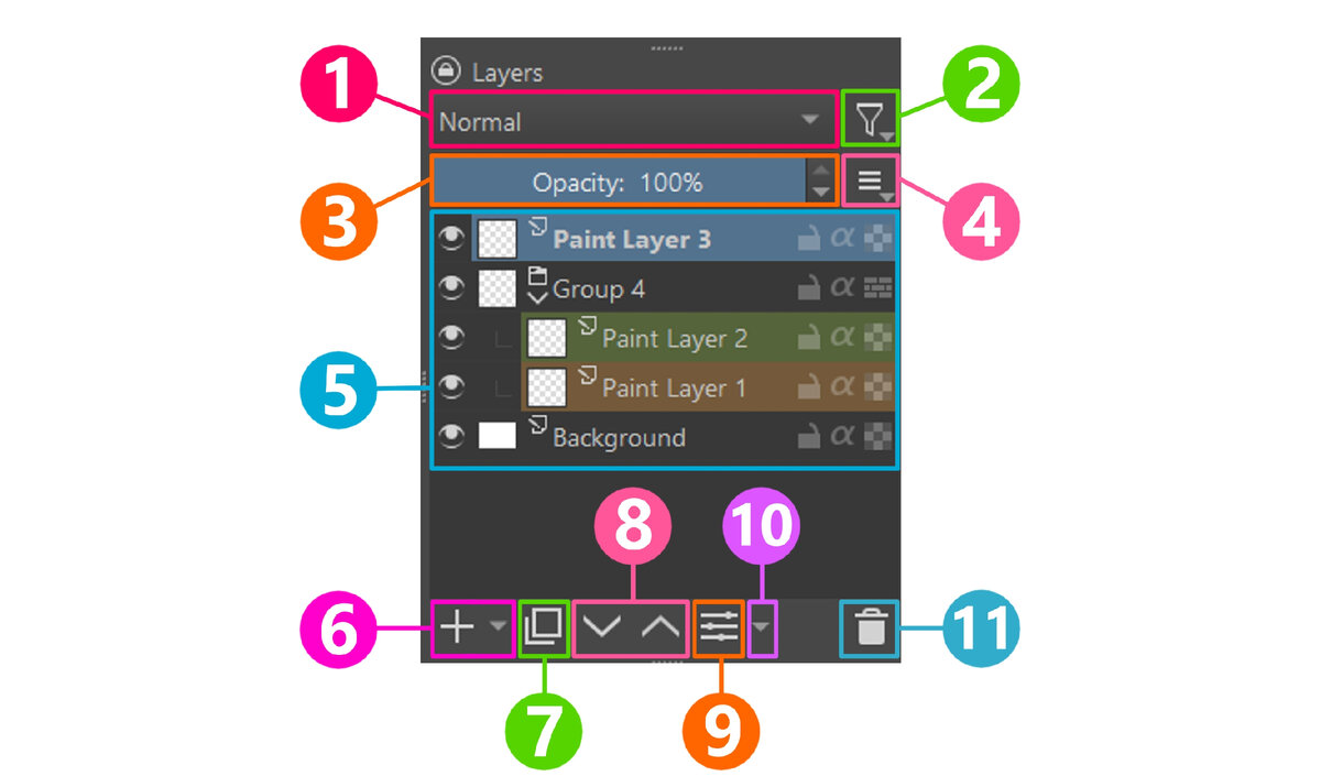 7 — Эта кнопка позволяет отключить редактирование альфа-канала. Из-за этого область рисования на слое будет ограничена пикселями предыдущих слоёв.