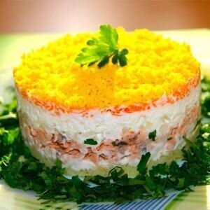 Салат "Мимоза" — это вкусный и универсальный рыбный салат,который украсит любой праздничный стол! Ингредиенты: Ингредиенты: •Сайра консервированная — 1 банка(250 гр.) Приготовление салата: • Подготовить продукты: картофель отварить(в мундире); отварить яйца; почистить морковь. • Нарезать мелко репчатый лук. • Сыр, морковь и картофель натереть на крупной терке. • Отделить белки от желтков. • Желтки измельчить вилкой, а белки натереть на крупной терке. • Вилкой растереть консервированную рыбу. • Нарезать зелень. Далее выкладываем слоями в следующем порядке: 1)Картофель(смазать слой майонезом) 2)Сайра(смазать слой майонезом) 3)Репчатый лук 4)Белок 5)Марковь(смазать слой майонезом) 6)Сыр(смазать слой майонезом) 7)Желток 8)зеленый лук(украсить) Праздничный слоеный салат из картофеля,сайры,лука,яиц,моркови и сыра готов! Приятного аппетита!