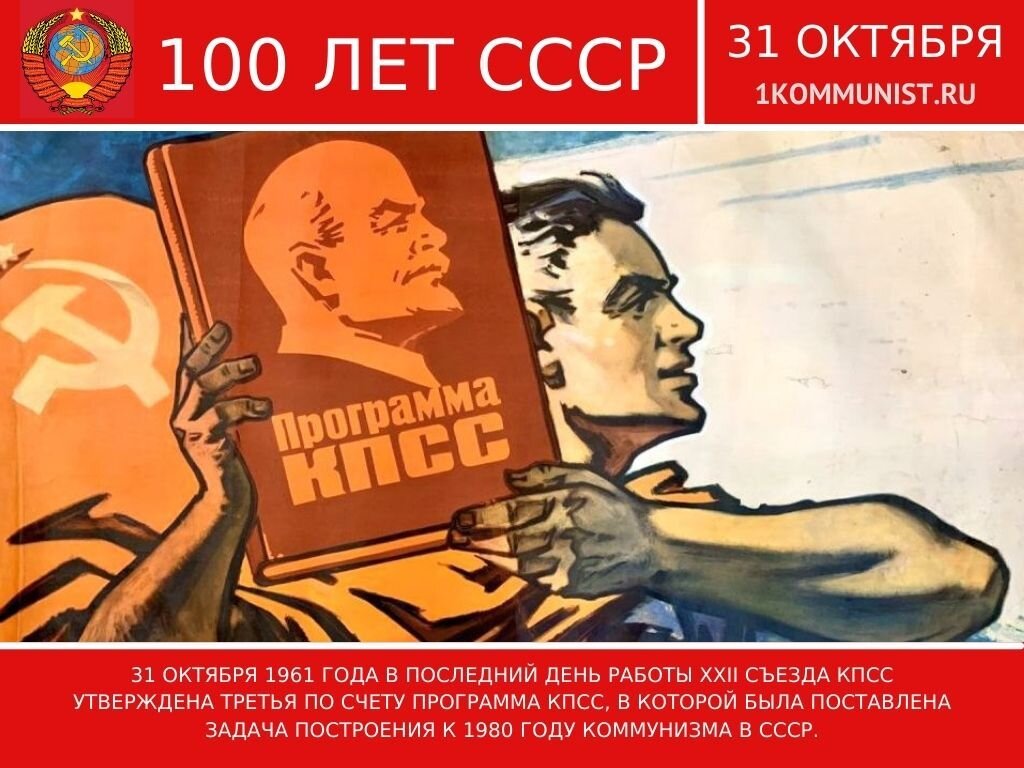 31 октября 1961 года в последний день работы XXII съезда КПСС утверждена третья по счету Программа КПСС, в которой была поставлена задача построения к 1980 году коммунизма в СССР.
