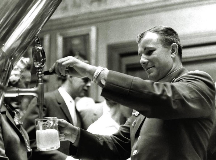 Юрий Гагарин наливает себе кружку пива во время посещения пивоварни Карлсберга, 1962 год