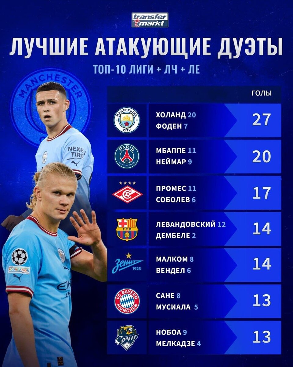 ❗Промес и Соболев – в тройке лучших пар нападающих в топ-10 лиг Европы по результативности после Холанда с Фоденом и Мбаппе с Неймаром