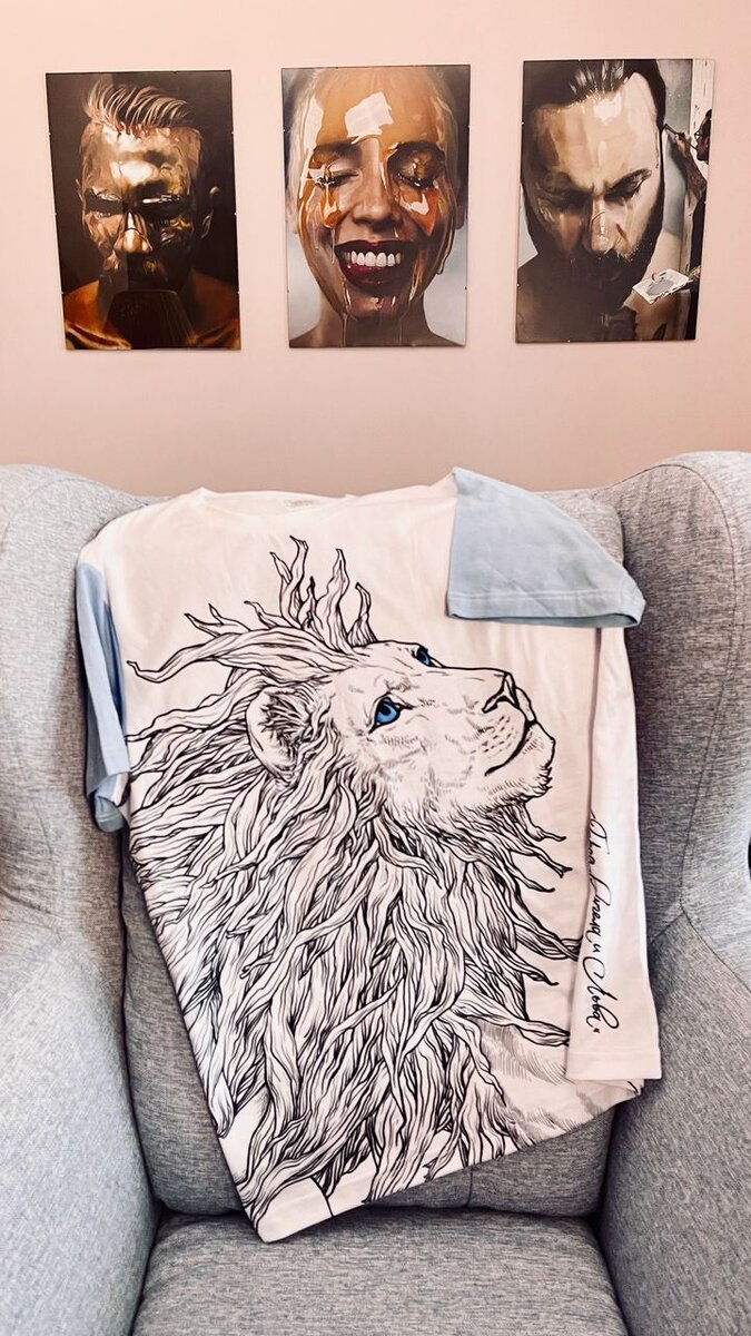 Я гуляла по рядам с книгами и внезапно натолкнулась на него. Лев смотрел на меня синими глазами, какой-то сказочно чудесный. – Великолепный артефакт – подумала я. Обожаю из поездок привозить с собой знаковые вещи. И размер мой. Я прикоснулась ко льву и…. разглядела небольшую зацепку на самом видном месте. – А есть в упаковке? – спросила я продавщицу. Она поискала и грустно покачала головой: – Нет. Как так? Ведь мало того, что лев так прекрасен, у меня в голове уже крутились фантастически красивые капсулы: с новыми ярко-синими лоферами, юбкой-плиссе, сине-голубыми кроссовками – я купила их недавно и они как будто ждали этого льва с пронзительным взглядом. Ну и артефакт. Я не могу кому-то отдать этот питерский артефакт! – Ок, а кто вам их поставляет? Может вы дадите мне сайт? Продавщица принялась рассматривать бирки. К ней подошла другая: – У них, вроде есть группа в VK. «Ангел и лев» или что-то похожее. – О, отлично! Сейчас поищу. А то мне очень понравилась эта футболка, но на ней небол