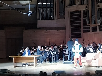 Во-вторых, исполнение заявили как концертное (и в афише, и в конферансе), что оказалось неправдой. Ведь степень театрализации определяется не наличием сценографии, тем более что минимально она присутствовала и здесь. Публике предложили полноценный спектакль режиссера Рамуне Ходоркайте и художницы Василисы Кутузовой. На авансцене стоял письменный стол, за которым Сальери трудился на ноутбуке, и кожаный диван, где чуть позже «развалился» шалопай Моцарт, были выстроены мизансцены, актеры нешуточно играли свои роли (а отнюдь не пели партии), причем с вовлечением и пространства зрительской части – словом, законченная постановка со своей концепцией. Суть ее заключалась в переносе истории в наши дни – видимо, тем самым публике хотели сообщить, что проблемы зависти и негениального злодейства вневременны и вечны. Два героя были одеты в современную цивильную одежду – Сальери чуть строже, в этакий полуофисный молодежный кэжуал, Моцарт – по-тинейджерски разбитно, в спортивный костюм и нелепую черную вязаную шапочку. Место скрипача, «пачкающего мадонну Рафаэля», занял смартфон: Моцарт снял на него бродячего музыканта и показывает другу видеоролик. Жесты, мимика, пластика артистов утрированно (особенно у Моцарта) показывали публике типичное поведение молодых людей XXI века, что совершенно не вязалось ни с музыкально-эмоциональным строем оперы, ни с высокой поэзией – пушкинских слов просто нет в нашем сегодняшнем лексиконе. Удивительно, как сами постановщики не чувствуют эту фальшь – никакого приращения смыслов из этого не получается, один абсурд.