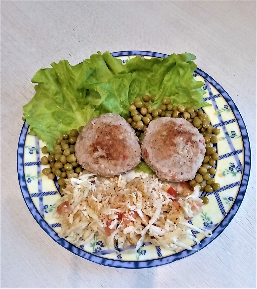 Итак, продолжаю процесс стройнения! Сегодня в меню - биточки мясо-овощные. На гарнир - горошек консервированный и салат (пекинская капуста/яблоко/помидор/лук репчатый). Фарш смешиваем с овощами и приправами, солим перчим по вкусу.