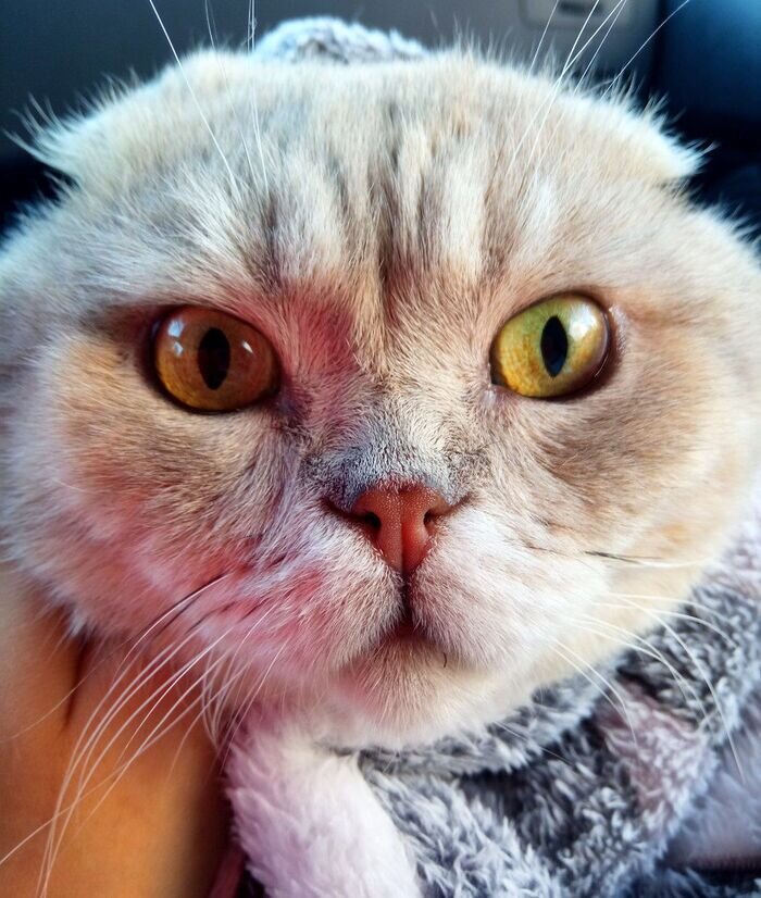 Знакомьтесь. Это котик с ОХД. Пока без имени, так как я только что его забрала. История начинается с того, что 4 дня назад мне написала женщина и попросила помочь пиаром котика, которого они нашли на дачах. Они его помыли, обработали от блох, сделали уколы Траумелем, но из-за большого количества собак, себе они его оставить не могут. Сегодня утром они позвонили и спросили, могу ли я посоветовать приют, куда можно котика отдать, так как собаки очень бурно на него реагируют и всем тяжелотяжело, а выпускать обратно жалко. Я объяснила ситуацию с приютами, заполненностью из-за войны новыми животными и так далее и предложила вариант: я даю им большую клетку для собак, а они ставят её куда-то в закрытую комнату, туда ставят лоток и я продолжаю котика пиарить. Договорились созвониться вечером. Что-то дёрнуло меня позвонить им днём. Как оказалось, очень вовремя. Котика захотела забрать женщина к своей вислоухой нестерилизованной кошке для создания новых котят. Вислоухий кот + вислоухая кошка -