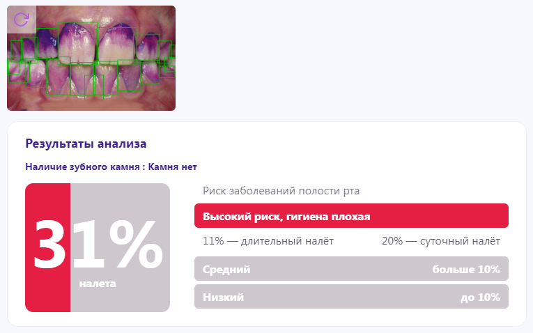 Отчет DIANA содержит в себе информацию о состоянии полости рта, количестве налета, качестве гигиены и риске развития заболеваний. У пациента наблюдается высокий риск развития заболеваний полости рта и неудовлетворительный уровень гигиены. Налет покрывает 31% поверхности зубов, располагаясь преимущественно в пришеечной области. 11% составляет длительный налет, 20% - суточный. Правильная гигиена полости рта является залогом поддержания здоровья всей зубочелюстной системы. Стоматологическое лечение у любого специалиста всегда начинается с очищения поверхности зубов от налета. Налет является фактором развития кариеса и его осложнений, поэтому его удаление как в клинике, так и в домашних условиях является важнейшим регулярным мероприятием. DIANA позволяет вывести уход за полостью рта на совершенно новый уровень. Окрашивание зубов и анализ фотографии дает максимально точный результат, который переводится в цифровое значение, на основе которых оценивается состояние полости рта, количество на