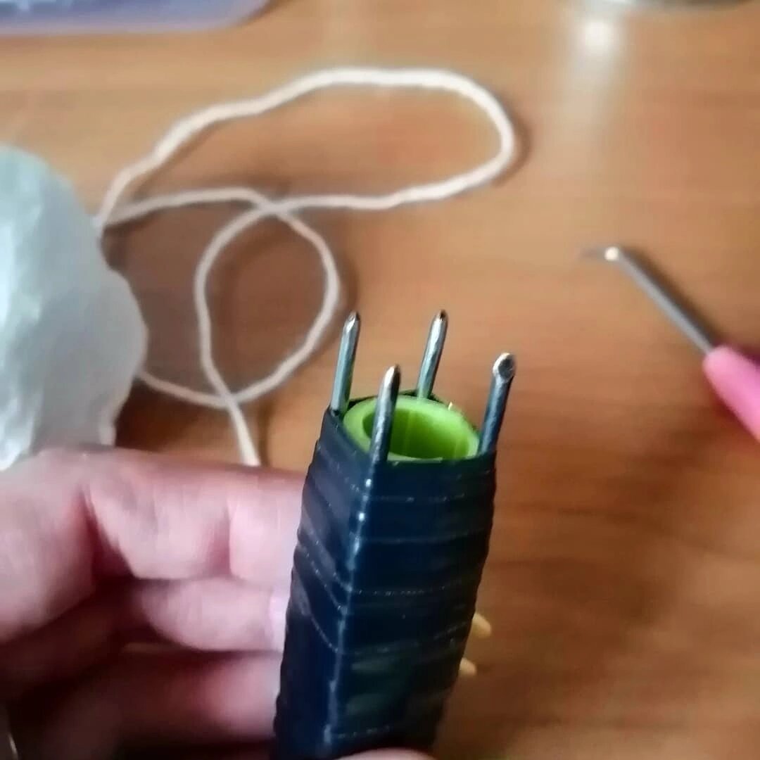 Это не орудие пыток и не электрошокер😂 Это всего лишь приспособление для плетения шнура😜, такой #лумдляшнура . Делала я его сама, лет 15-17 назад, когда у нас так широко еще не продавались материалы для рукоделия, а мне срочно нужен был плетёный шнур. Когда то в детстве делали подобные приспособления из деревянной катушки от ниток, вбивали в нее гвоздики. За основу взяла футляр от негодного толстого фломастера и две чулочные спицы, я ими не пользовалась. Спицы перекусили пополам. Примотала эти 4 штырька к фломастеру, сначала скотчем, потом прошлась изолентой. Пользуюсь не часто, но иногда пригождается. Процесс плетения (вязания) шнура, как на луме. Обвиваем штырьки по кругу и поднимаем петли предыдущего ряда. Попыталась показать процесс: Такой шнурок получается на четырех штырьках, а их количество можно варьировать. #лум #плетеныйшнур #шнур #шнурналуме #плетушнур #плетениешнура #loom #knitloom