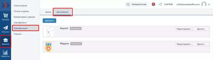Добавить в аккаунт достижения можно в разделе «Тренинги - Геймификация»