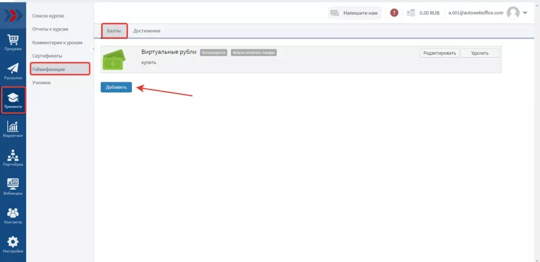 Для добавления виртуальной валюты зайдите в раздел Тренинги - Геймификация - Баллы и нажмите “Добавить”: