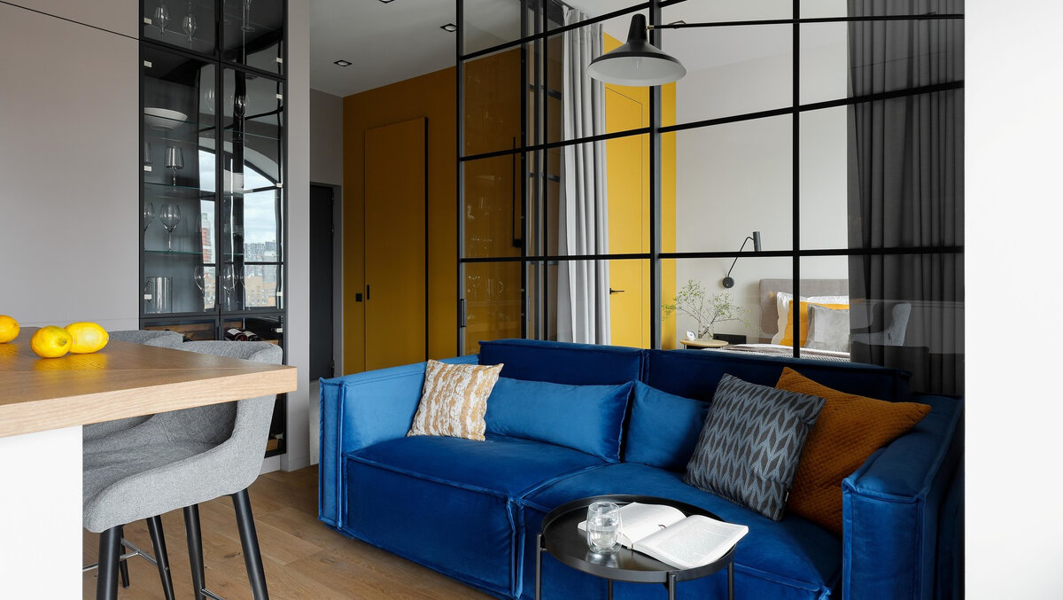 Заказчица пришла к нам с очень четким пониманием того, что ей хотелось бы видеть в интерьере своей квартиры. Ее мечтой была стеклянная лофт-перегородка, черные лофтовые элементы в интерьере (светильники, вытяжка, аксессуары), сочетание глубокого сложного синего и теплого медового оттенка. При этом важно было не перегрузить интерьер цветом и деталями.