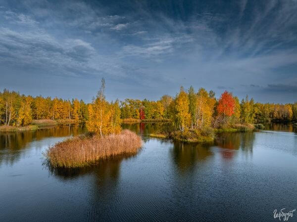 Популярность, свалившаяся на Романцевские горы из-за того что наши люди прокладывают туристические маршруты исключительно в России, подвигла наши власти сделать из Кондуков цивильный отдыхарий. Но пока с цивилизацией в этих местах не густо — в недавно диких местах летом в хорошую погоду все забито машинами, и из каждой орёт музыка. Толтотня. И мусор, мусор… Поэтому я туда езжу теперь только осенью, по холодку. Туристов нет, тишина, красота. Золотым октябрем везде хорошо, а уж когда разноцветные деревья отражаются в синей воде и солнышко через них просвечивает, так просто невозможно наглядеться… Природа как будто спит. Или наоборот — она нам снится. Крошечные островки посреди озер с дрона смотрятся как игрушечные. Есть в осени некоторый избыток декоративности. И недаром такому явлению отводится не слишком много времени: глаз наверное уставал бы все время видеть это буйство красок. Но полюбоваться им перед наступление глухой черноты ноября просто необходимо. Не пропустите!