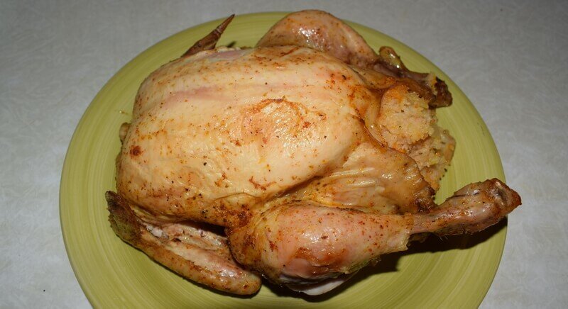 Достаточно простое и невероятно вкусное блюдо. Курица получается варено-тушеной, невероятно мягкой и ароматной, а рис очень приятным на вкус. Отличное блюдо. Рекомендую! Порции: –+6 Ингредиенты: Для маринования курицы Для начала на 1 час заливаем рис холодной водой. Теперь маринуем курицу. Для этого ее тщательно помоем и обсушим. Смешиваем соль и специи и натираем курицу изнутри и снаружи со всех сторон. Оставляем мариноваться на 45 минут. Из того количества смеси соли и специй может остаться примерно одна чайная ложка. Она нам еще пригодится. Тем временем отвариваем рис до полуготовности (минут 5). Лук режем тонкими четверть кольцами. Морковь натираем на терке. На растительном масле обжариваем лук до прозрачности 3 минуты на среднем огне. Добавляем морковь и обжариваем овощи еще 3 минуты. Смешиваем рис, лук и морковь, и остатки соли и специй для курицы. Оставляем «отдохнуть» минут на 20. Фаршируем маринованную курицу рисом и овощами. Запечатываем зубочистками. На противень выкладываем