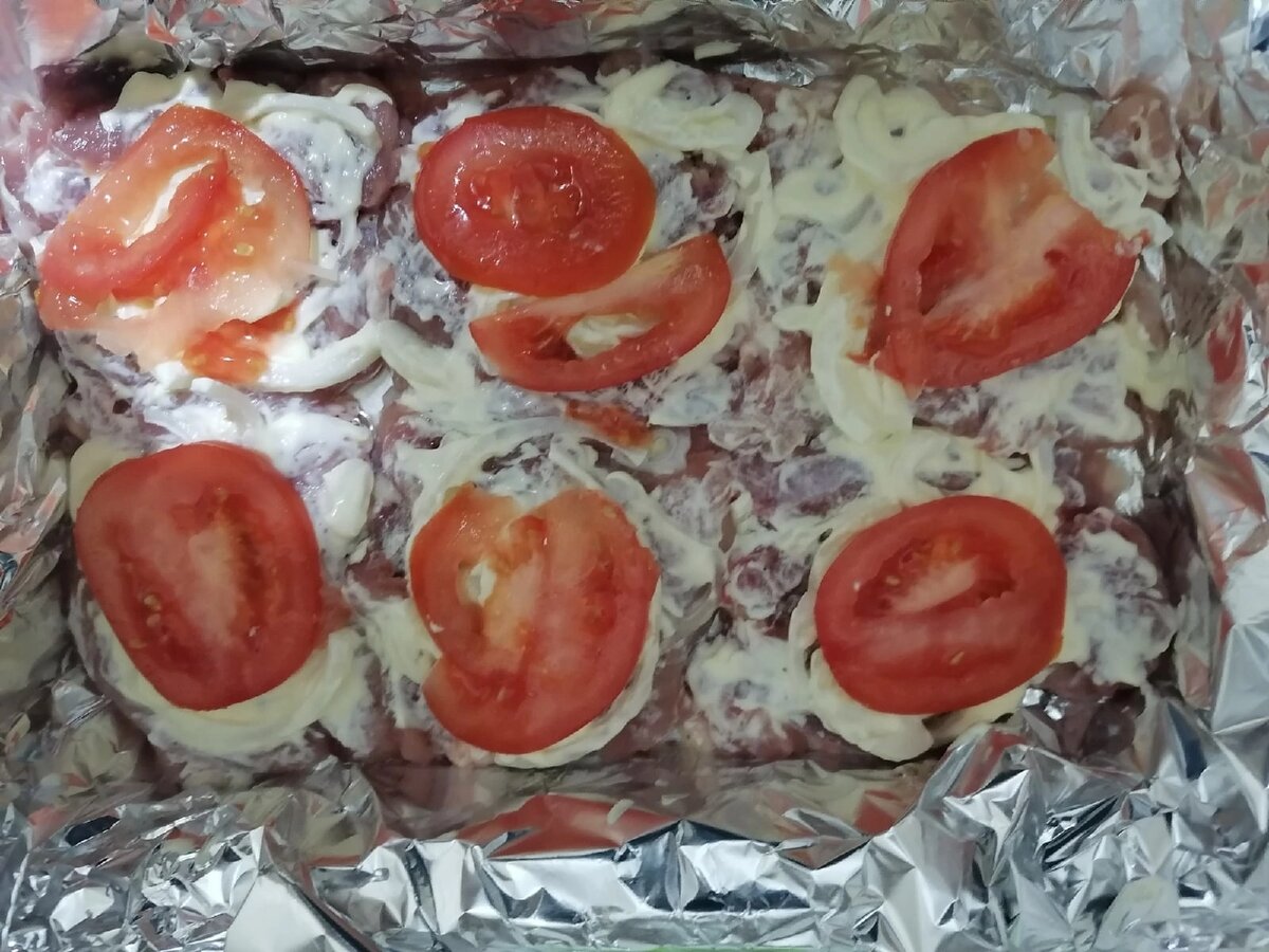 Классический рецепт этого блюда не всем нравится, поэтому я решила придумать свой. Уверяю Вас, что это мясо "По-французски" не оставит гостей равнодушными. ИНГРЕДИЕНТЫ ПРИГОТОВЛЕНИЕ 1.Подготовим все ингредиенты. Филе бедра отбиваем, солим и перчим по вкусу. Помидоры и лук нарезаем тонкими кольцами. Сыр натираем на мелкой тёрке. 2. Разогреваем духовку до 180 градусов. 3. Противень укрываем фольгой и смазываем маслом. 4. Выкладываем слоями: 5. Накрывает все фольгой и отправляем в разогретую духовку на 25 минут. 6. Через 25 минут снимаем фольгу и выкладываем на каждый кусочек горку сыра. 7.Не накрывая, отправляем ещё на 15-20 минут в духовку при температуре 200 градусов. Очень сочное и нежное мясо готово! Приятного аппетита!
