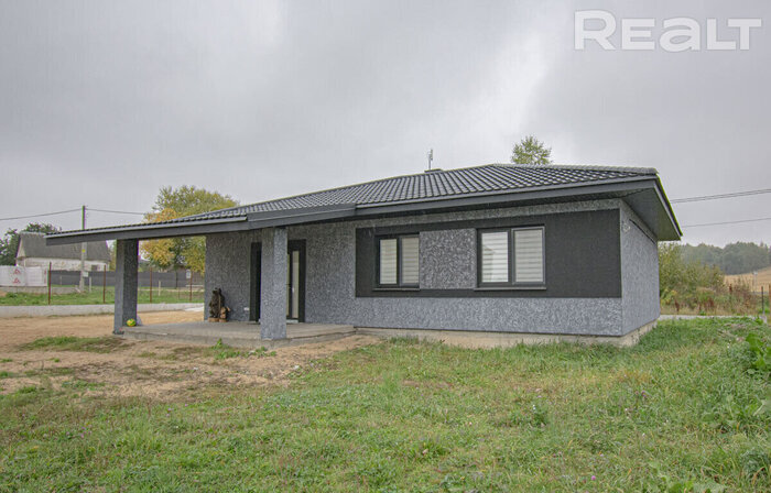 В продаже появился новый загородный дом в 8 километрах от Каменной Горки. Он компактный, с современной планировкой, со всеми коммуникациями, готов к проживанию. К нему прилагается новое отапливаемое строение на 106 «квадратов», которое можно переделать под любые цели и задачи. Узнали стоимость. Локация удобная — Минск рядом, асфальт к самому дому. Деревня Клюи небольшая, но с перспективой вырасти в респектабельный коттеджный поселок. Дом новый, 2021 года постройки. Он одноэтажный, с вальмовой крышей. Стоит на надежном фундаменте, поверх стен из блоков (500 мм) отлит железобетонный армопояс. Кровля - модульная черепица BUDMAT, окна и двери - Salamander с фурнитурой Roto. Планировка проста и функциональна. У входа в дом находятся прихожая, топочная (с санузлом), ванная комната, гостиная-кухня и три комнаты. В интерьере преобладают светлые тона с яркими акцентами. Использовались дорогие отделочные материалы: итальянская плитка, штукатурка «Отточенто», потолки из гипсокартона. Сантехника б