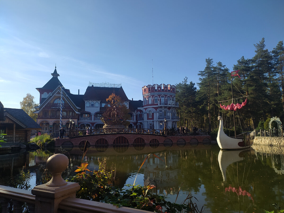 Разнообразные домики в сказочном стиле, деревянная детская площадка, фигурки сказочных героев, карета, конь, идеальное место для фотосессии. Домики расположены на огромной лесной территории. Посещение возможно с собакой любого размера, пишу, потому что встретили посетителей с собаками.