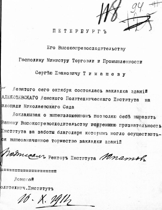 В письме также отмечалось: «К величайшему сожалению открытие Донского политехнического института омрачается тем, что для этого учреждения не отведено достойного места в центре города ... Вследствие этого мы, нижеподписавшиеся граждане г. Новочеркасска, позволяем себе почтительнейше просить Ваше Высокопревосходительство о содействии к увенчанию величайшего для Дона дела и льстим себя надеждою, что просьба сынов Дона, горячо любящих его, не останется неуслышанною тем, кто признал за Донским политехническим институтом государственное значение".