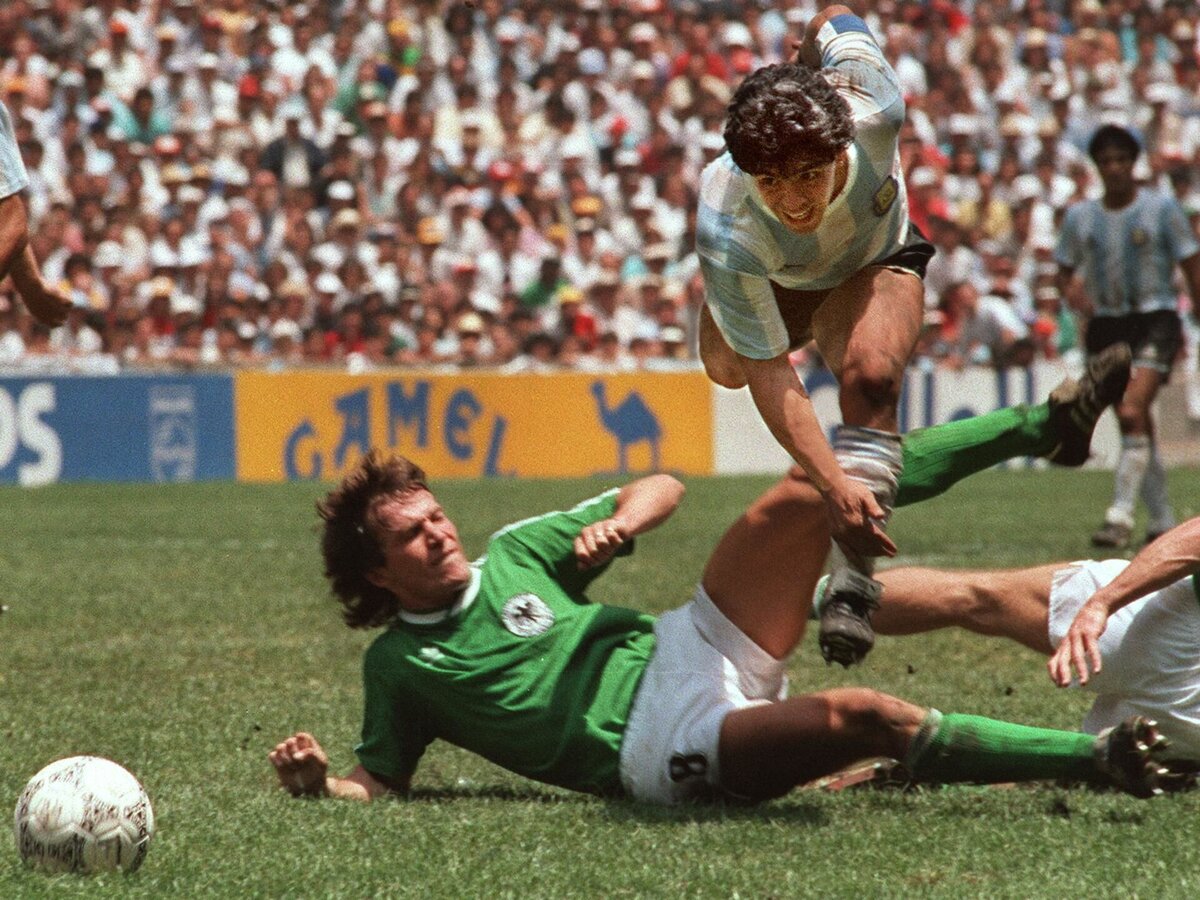 На 51-ой минуте четвертьфинала с Англией Диего после свечки английского защитника, высоко выпрыгнув рукой в противоборстве с Шилтоном, кулаком переправил мяч в сетку. "Я и сам не знаю, как сумел выпрыгнуть так высоко. Я выставил кулак левой руки, вратарь Питер Шилтон этого даже не заметил, и первым, кто стал требовать отмены гола, оказался набегавший сзади Фенвик. Не потому, что он это видел, а потому, что не мог понять, как можно выиграть единоборство в прыжке у вратаря. Когда я увидел, что судья на линии побежал к центру поля, то с радостными криками бросился к трибуне, где сидели отец и тесть... Мой старик высунулся наполовину, убежденный, что я забил головой. Я праздновал гол, спрятав левый кулак и глядя искоса на судей, потому как боялся, что они могут что-нибудь заподозрить. К счастью, этого не произошло. Тем временем все англичане бурно протестовали, а Вальдано сказал мне «тс-с-с!», прижав палец к губам, как если бы мы фотографировали медсестру в больнице. Я прикинулся дурачком, потому что мне не оставалось ничего иного. Я прыгнул, взмыл вверх и выставил кулак позади головы... Мяч, который заставил англичан изойти слезами... Как год спустя я сказал одному журналисту из ВВС: «Это был абсолютно чистый гол, потому что его засчитал судья. А я не тот человек, чтобы сомневаться в его честности".