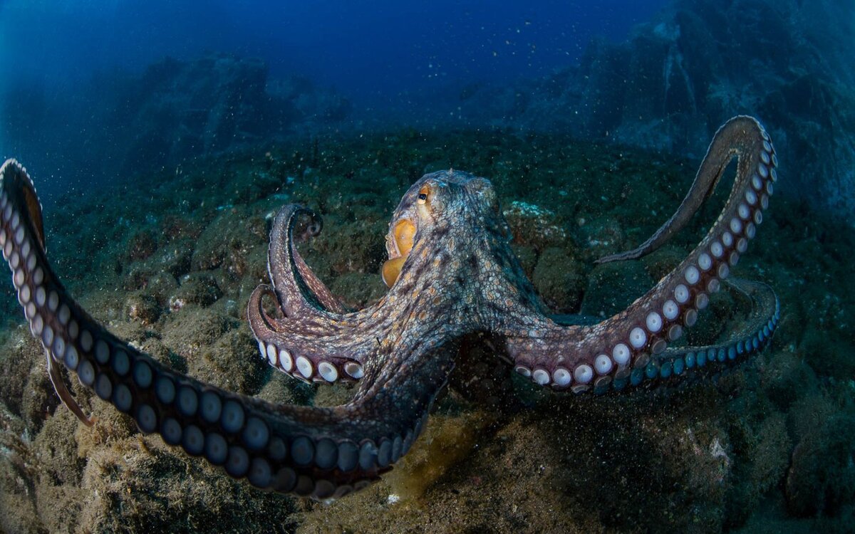 Осьминог был роскошен: когда стоит на дне — с человека ростом, присоски в основании рук словно пиалы. Атласная кожа играет алым и чёрным не хуже плаща Отелло. Гоняя воду, вытянутая голова надувает сердитые щёчки, под ней округляется щель — край мантии. Каждый глаз смотрит в свою сторону, как у хамелеона, и похож на золотистую жемчужину с кулак, которую рассекает горизонтальная полоска-зрачок.