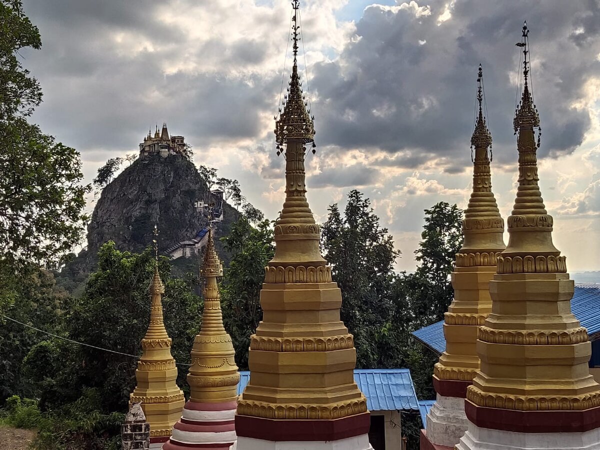 Попа - это не просто попа. Вернее Попа - это не попа, не то место из которого растут ноги. Попа - это Попа, это то место из которого растут наты... Хоть в Попе и грязно как в попе, и спрятана Попа в самой «попе» мира, но что-то в этой Попе все равно есть от цветка, которым она и является в переводе с санскрита . И ведь на самом деле из Попы растут ещё и цветы, которые не растут больше нигде в Бирме. И, зная это, король Аноратха, каждый день посылал сюда своего любимого гонца У Бьят Та их нарвать... Надо сказать что пробежка была зачётной - расстояние от Пагана до Попы более 50 км.. Однажды бегун встретил на горе великаншу горы Май Вунна и у них случилась любовь... 100 км + любовь... Понятное дело, что бегун опоздал с цветами назад. Несколько раз простили. Но гонец не унимался и продолжал опаздывать.. И в один момент Аноратха рассвирепел и велел своего уникального гонца казнить. Узнав об этом, Май Вунна тут же умерла от тоски по возлюбленному.. Но Аноратха был великий король и узнав об
