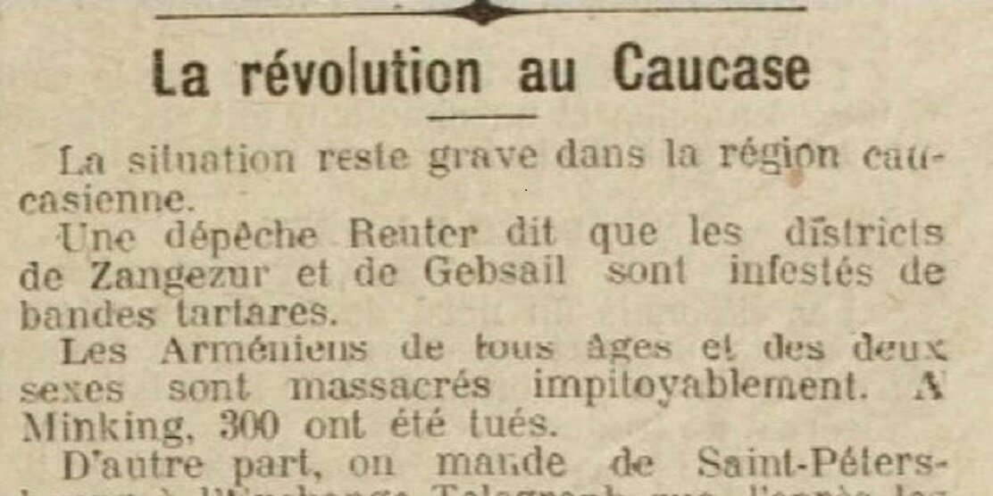 Центр арменоведения Российской и Ново-Нахичеванской епархии ААЦ представляет отрывок из газеты «La Charente», опубликованной 14 сентября 1905 года. «В Кавказском регионе ситуация остается серьезной. В депеше Рейтера говорится, что районы Зангезура /Сюник – прим. ред./ и Джебраила /Джракан – прим. ред./ кишат татарскими бандами, которые безжалостно вырезают армян всех возрастов и обоих полов», – сообщается в газете, где под «татарскими» авторы имеют ввиду азербайджанцев. Просто такого слова как «азербайджанцы» в 1905 году еще не было. «В Минкенде было убито 300 жителей-армян», – продолжает автор заметки. Отметим, что Минкенд – это бывшее армянское село на территории современного Лачинского района. То есть в газете упоминается забытая сегодня страница истории — резня армян в Лачинском районе в начале 20 века. «В тоже время из новостей, полученных по телеграфу из Санкт-Петербурга, мы узнаем, что татары разграбили армянские монастыри, убивая при этом женщин и детей. Происходят сцены неопис