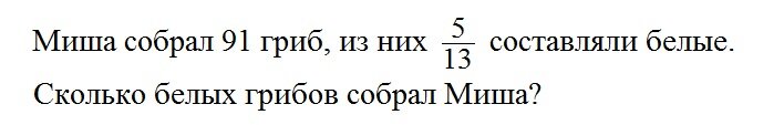 Нахождение дроби от числа, нахождение процентов от числа Уважаемые мамы и папы, дедушки и бабушки! Предлагаю повторить нахождение дроби от числа и нахождение процентов от числа на примере решения задачи 393 и слегка изменённой задачи 396 из 7-го издания учебника по математике для 6-го класса авторов А. Г. Мерзляка, В. Б. Полонского и М. С. Якира под редакцией. В. Е Подольского. Условие задачи 393: Решение: Школьники 5-го класса решают такие задачи в два действия: 1) 91 : 13 = 7 грибов – одна тринадцатая часть 2) 7 * 5 = 35 белых грибов собрал Миша Ответ: Миша собрал 35 белых грибов. При этом шестиклассники должны уметь сокращать в перемножаемых дробях числитель и знаменатель на их наибольший общий делитель – в данном случае у чисел 91 и 13 он равен 13. Сократив числитель и знаменатель на 13 мы получили вместо 91 – 7, а вместо 13 – 1. Вывод: чтобы найти дробь от числа, можно число умножить на эту дробь (§12). Условие задачи 396: Отряд из 120 человек отправился в поход на лодках. В ка
