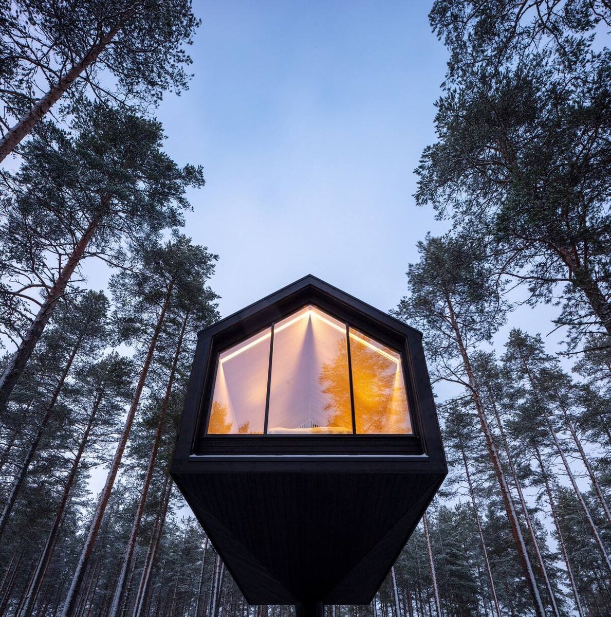 Идея единения с природой и адаптации вековых традиций к современному миру уже давно популярна в архитектуре и дизайне. Одним из воплощений этой тенденции стал оригинальный дом Niliaitta от финских архитекторов из Studio Puisto. Обратившись к технологиям саамского деревянного строительства, специалисты этой студии возвели в лесу дом для курорта Кивиярви. Конструкция поднята над землей и установлена на одной единственной колонне. Это позволило снизить ущерб для природы и сохранить максимально возможное количество деревьев на данной территории. Дом облицован снаружи рейками, тонированными в темный цвет, напоминающий старое дерево. За счет этого строение органично вписывается в пейзаж. Дизайн помещения выполнен в современном стиле. В отделке использована древесина светлых тонов. Этот прием в сочетании с панорамным окном, полностью занимающим одну из стен, делает внутреннее пространство наполненным светом и воздухом. Несмотря на то, что дом находится вдали от цивилизации, он оснащен всеми с