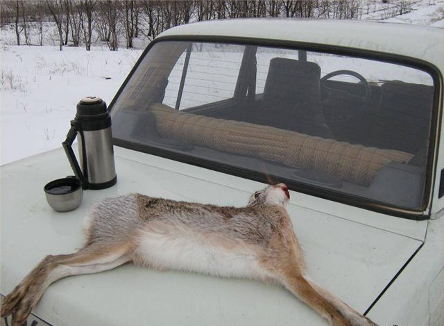 Суббота. Оттепель, сильный ЮВ ветер, ночью срывался дождь. «Жигуль» категорически отказывается ехать по просёлку. Даже небольшой бугор приходиться брать с десятого раза. После очередного подъёма, вдоволь набуксовавшись, бросаю машину, экипируюсь и вперёд. Отшагав с километр по гребню здоровенной балки, сожжённой каким-то умником прошедшим летом, замечаю на противоположной стороне зайца, скачущего встречным курсом. По обоим склонам балки располагались негустые лесополосы, травяная подстилка которых была уничтожена, по всей вероятности тем же палом. Расстояние до зайца было метров 250 и было непонятно, что или кто побеспокоил его в столь ранний час. Провожаю косого взглядом, он спускается в балку и пересекает её где-то примерно в районе брошенной мной машины. Зная «привычку» этих зверей носится кругами, предполагаю, что заяц теперь по «моей» стороне катит на всех парусах ко мне под выстрел, занимаю «стрелковую позицию». Двадцать минут ожидания проходят впустую. Вспоминаю, что рядом с маш