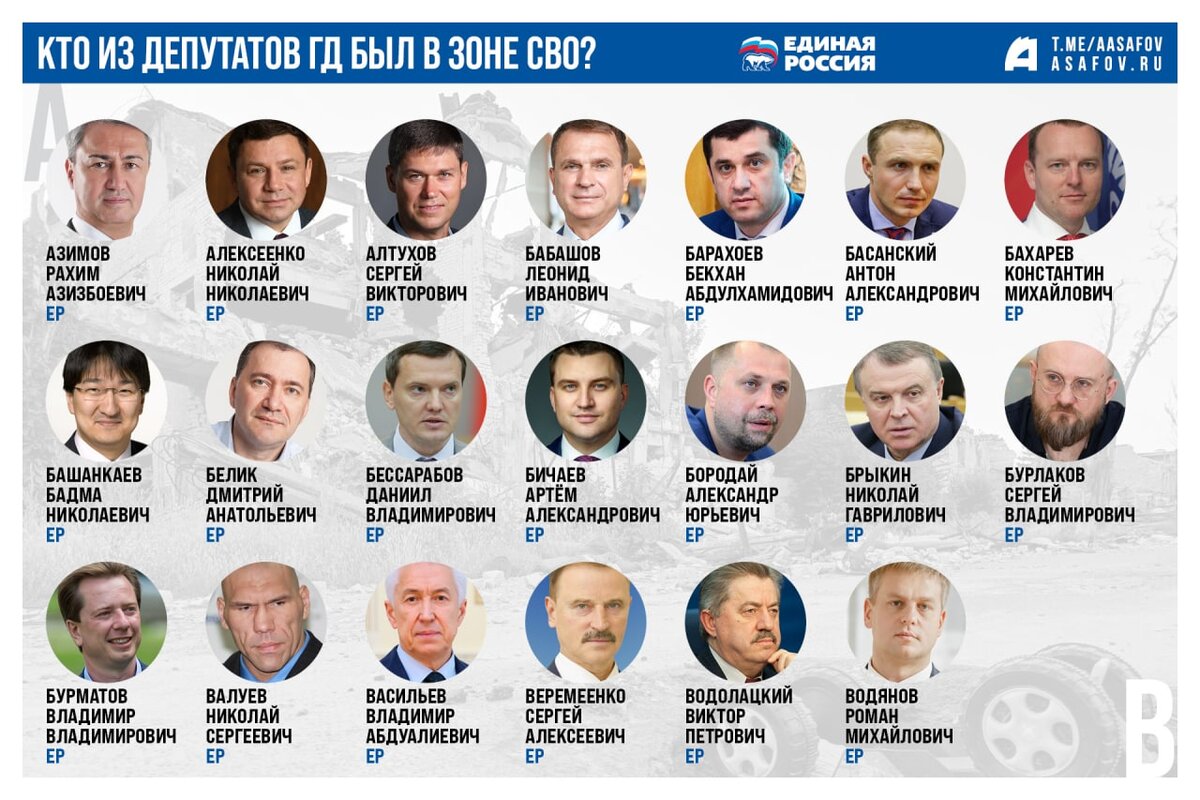 Обновил информацию по депутатам, побывавшим в зоне СВО и на освобожденных территориях. Всего в зоне СВО побывали 153 депутата, или 34% нижней палаты парламента. Обновленное число депутатов ГД, побывавших в зоне СВО: 📍 «Единая Россия» – 119 (+37 человек) 📍 ЛДПР – 13 (+8 человек) 📍 СРЗП – 11 (+7 человек) 📍 КПРФ – 6 (без изменений) 📍 «Новые люди» – 4 (+3) Процент депутатов, посетивших зону СВО, от их общего числа во фракции на сегодня выглядит так: 📍 «Единая Россия» – 37% 📍 ЛДПР – 52% 📍 СРЗП – 39% 📍 «Новые люди» – 27% 📍 КПРФ – 11% Также каждый день из регионов поступает информация по получившим повестки в рамках частичной мобилизации депутатам разных уровней и чиновников. Например, в регионах получили повестки депутаты: 📍 Михаил Абдалкин (КПРФ) 📍 Мичил Николаев (СРЗП) 📍 Дмитрий Холин (ЕР) 📍 Дмитрий Сигачев (ЕР) В приморском правительстве повестки получили 150 чиновников. В Самарской области – 300 региональных чиновников. В Санкт-Петербурге призвали замглавы город