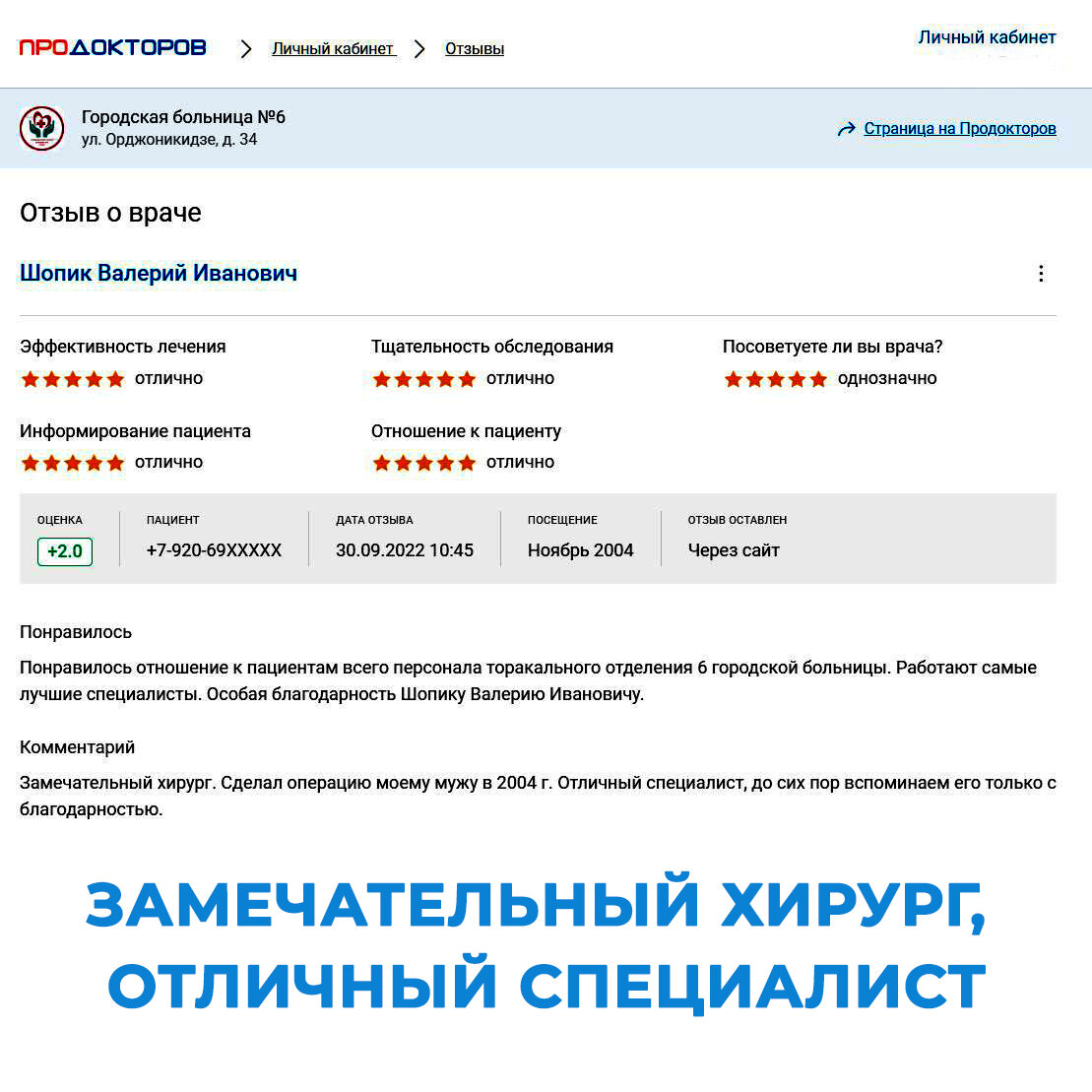 ЗАМЕЧАТЕЛЬНЫЙ ХИРУРГ, ОТЛИЧНЫЙ СПЕЦИАЛИСТ Благодарность хирургу ГКБ №6, Шопику Валерию Ивановичу. "Понравилось отношение к пациентам всего персонала торакального отделения 6 городской больницы. Работают самые лучшие специалисты. Особая благодарность Шопику Валерию Ивановичу. Замечательный хирург. Сделал операцию моему мужу в 2004 г. Отличный специалист, до сих пор вспоминаем его только с благодарностью."