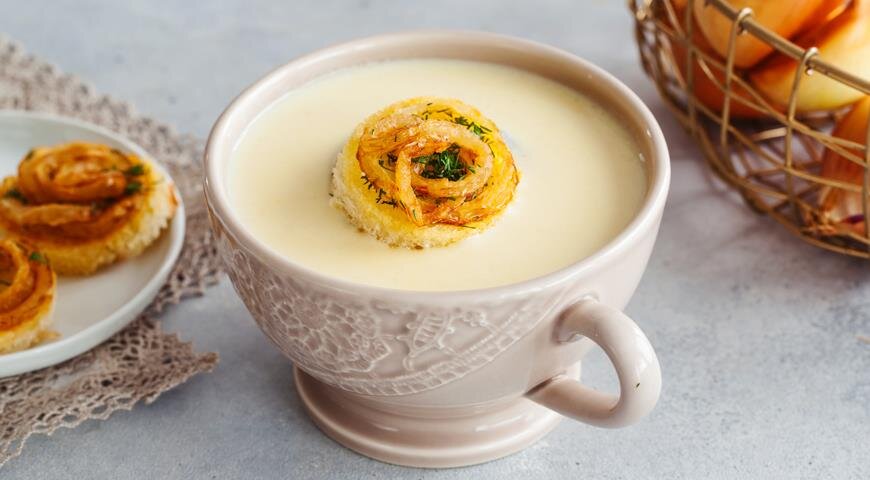 Ингредиенты: Для начала подготовим овощи. Нарезаем крупными кубиками картофель, лук и корень сельдерея. После чего разогреваем сковороду и добавляем туда 2 столовые ложки оливкового масла. Обжариваем наши овощи в течении 5 минут. После чего добавляем вино и продолжаем готовить еще в течении 2-3 минут. По истечению времени заливаем наше блюдо горячей водой, ждем пока закипит и тушим овощи еще в течении 25 минут. Далее нужно перемолоть все овощи до состояния пюре. Это проще сделать блендером, но если его нет- то можно воспользоваться обычной ложкой и вилкой. После че натираем сыр на крупной терке и добавляем перец и соль по вкусу. Изюминка на этом блюде - это мускатный орех. Добавляем его в самом конце! Далее довести суп до кипения и снять с плиты. Далее нам нужно приготовить гренки. Берем наш нарезанный батон, в идеале багет. И жарим на сливочном масле на сковороде до золотистой корочки. После чего нарезаем лук на кольца и точно так же обжариваем до золотистой корочки. Блюдо готово. Р