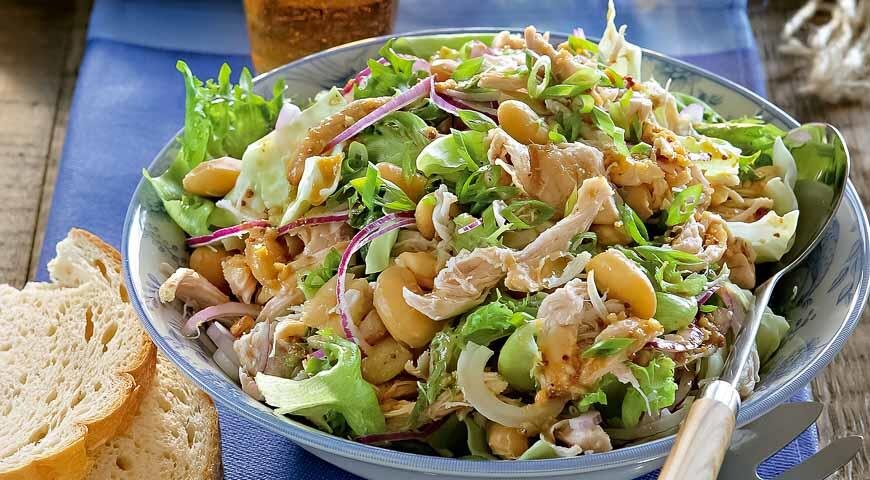 Когда после тяжелого дня хочется порадовать себя вкусным ужином, а сил что-то долго готовить уже просто нет, всегда на помощь придут салаты с сочной курочкой. Они всегда радуют своим вкусом и легкостью, а вкусные кусочки курятины будут хорошим завершением в любой день. Рецепт салата с курицей и фасолью Ингредиенты Для соуса потребуются по чайной ложке горчицы и лимонного сока, 2 столовые ложки оливкового масла, соль и перец. Приготовление Приятного аппетита!