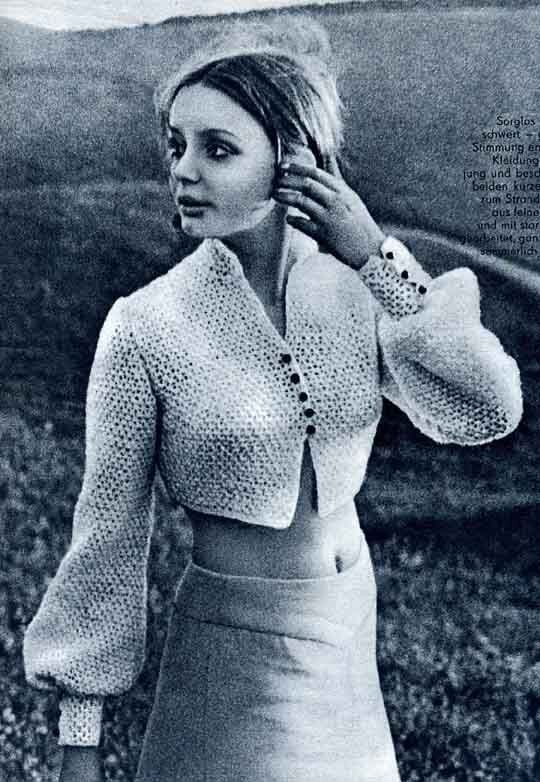 Среди журнальных ретромоделей, связанных крючком, немало жемчужин. Особенно радуют конструкция изделий, стилевое и композиционное единство. Поделюсь сегодня своими любимчиками. В этой модели Втачной рукав, стремительно расширяющийся в нижней части и собранный на манжету. Горловина круглая под горлышко, сверху надвязана небольшая стойка. Хорошо подобрана пряжа, которая, с одной стороны, держит форму изделия в целом и стойки в частности, с другой, не выглядит слишком грубо в складках на рукаве. В этой модели кокетливые вырезы на рукаве сочетаются с "капелькой" на груди. При этом по верху капля закрыта резинкой. Также с помощью резинки осуществляется приталивание. Элегантный брючный костюм с миниатюрным отложным воротничком. В этом джемпере изюминка - горловина. С одной стороны сочетание круглого и треугольного выреза. Но здесь это усилено оформлением в виде мотивов. В этом костюме все внимание - на верхнюю часть! Воротник- стойка с разрезом выполнен в контрастном цвете. Он же оформля