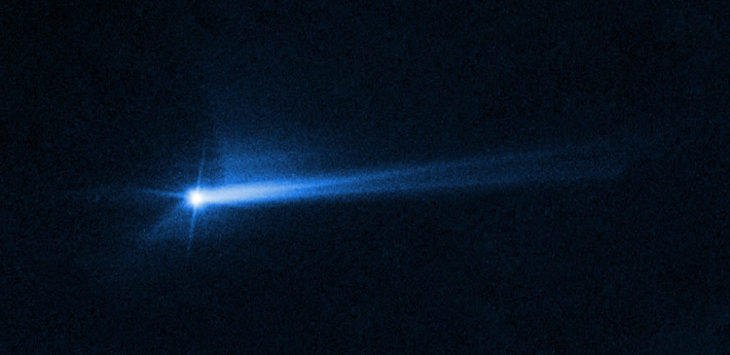 По словам главы НАСА Билла Нельсона, импактор размером с холодильник, предназначенный для испытания на перенаправление двойного астероида (DART), удачно врезался в лунный астероид Диморфос 26 сентября. Он вытолкнул его на меньшую и более быструю орбиту вокруг своего «старшего брата», Дидимоса. «DART сократил орбиту с 11 часов 55 минут до 11 часов 23 минут», — сказал он. Ускорение орбитального периода Диморфоса на 32 минуты превысило ожидания НАСА в 10 минут. «Мы показали миру, что НАСА серьезно относится к защите этой планеты», — добавил Нельсон. На этом снимке, сделанном космическим телескопом НАСА «Хаббл» 8 октября 2022 года, показаны обломки, выброшенные с поверхности Диморфоса через 285 часов после того, как 26 сентября DART намеренно столкнулся с астероидом. Форма этого хвоста со временем изменилась. Фото: НАСА / ЕКА / STScI «Все мы несем ответственность за нашу родную планеты. В конце концов, это единственное, что у нас есть, — заключил администратор НАСА. — Эксперимент показал,