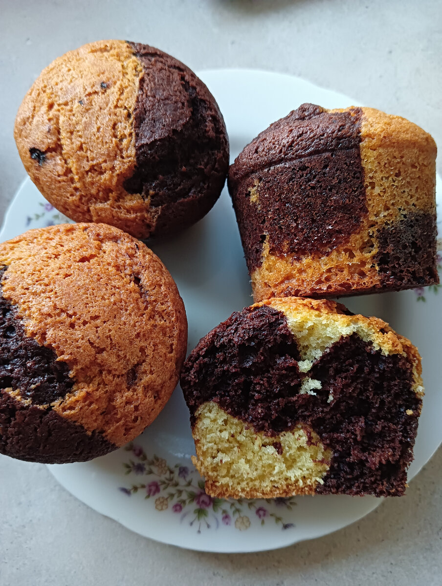 В формочки выкладываем справа белое тесто, а слева шоколадное, а затем вторым слоем наоборот справа шоколадное тесто, а слева белое.