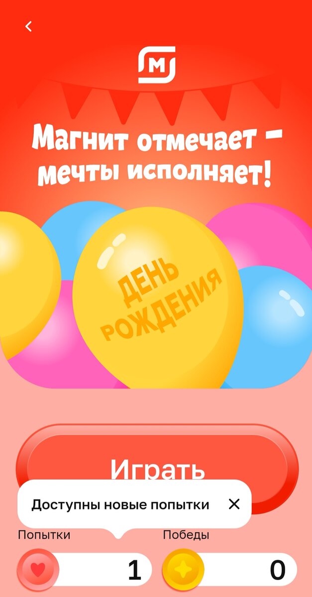 Сегодня, то есть с 12 октября по 8 ноября стартует игра в приложении МАГНИТ. Ежедневно у нас есть 1 попытка игры , в которой можно получить призы . Новая попытка появляется каждые 24 часа .