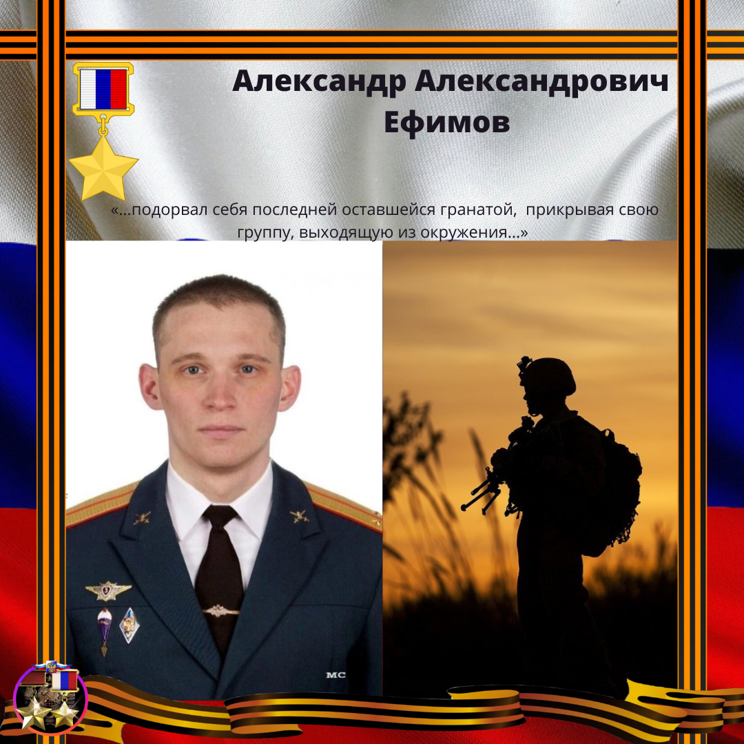 Александр Александрович Ефимов родился 25 ноября 1994 года в Можге Удмуртской Республики.После окончания школы поступил в Новосибирское высшее военное командное училище, год выпуска – 2018-й. Прохождение военной службы он начал в должности командира разведывательного взвода. Принимал участие в специальной военной операции на территории Украины, Луганской и Донецкой Народных Республик в должности заместителя командира роты разведывательного батальона. Александр Ефимов был тяжело ранен при боестолкновении с ВСУ в Харьковской области 25 марта 2022 года. Раненый офицер дал группе приказ отступать, а себя подорвал последней оставшейся гранатой, прикрывая свою группу, выходящую из окружения чтобы отрезать путь противнику. Указом Президента Российской Федерации («закрытым») от 29 сентября 2022 года за мужество и героизм, проявленные при выполнении задач в ходе специальной военной операции, старшему лейтенанту Потапову Александру Игоревичу присвоено звание Героя Российской Федерации (посме