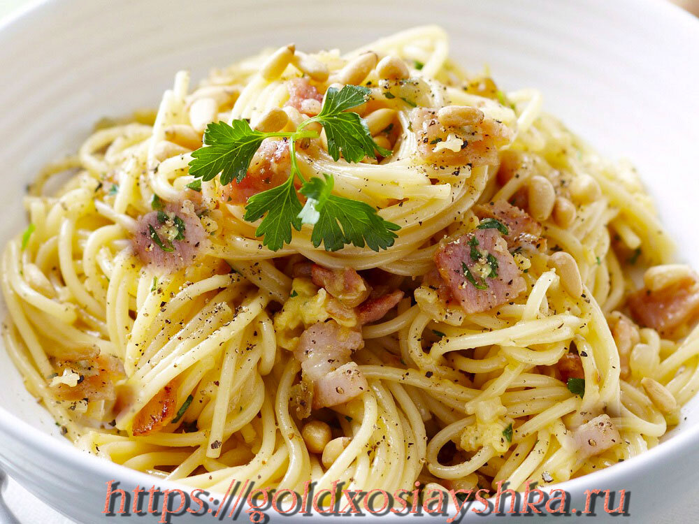 Паста карбонара - классический рецепт итальянской кулинарии, но паста также является одним из популярных и любимых Россиянами блюд. К тому же готовить блюдо просто, легко и важно из доступных ингредиентов. Какое вкусное, аппетитное, сытное блюдо можно приготовить быстро? Да, да - карбонара! Ингредиенты: Способ приготовления блюда "Паста карбонара" Нальем в кастрюлю воду и поставим на огонь. Пока закипает вода измельчим бекон кубиками либо соломкой по вкусу, дольки чеснока порежем крупно и немного придавим лезвием ножа. Затем в предварительно разогретой сковороде растопим сливочное масло, добавим измельчённые бекон и чеснок, жарим на слабом огне минуток так 10. Бекон должен получиться мягким, но жир выпариться. Удалим из бекона дольки чеснока и выключим огонь. Вода в кастрюле закипела, добавим соль, оливковое масло, спагетти. Варим спагетти так, как указано на их упаковке, важно соблюдать указанное время варки, чтобы сварить спагетти правильно. Одно куриное яйцо и желтки 3-х куриных яиц