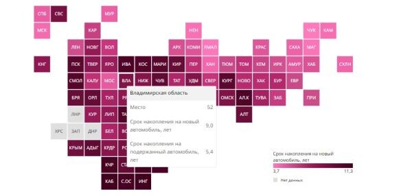 Быстрее других это могут сделать жители Чукотки, ЯНАО и Магаданской области, а жителям республик Северного Кавказа дольше всего придется откладывать сбережения для покупки новой машины
