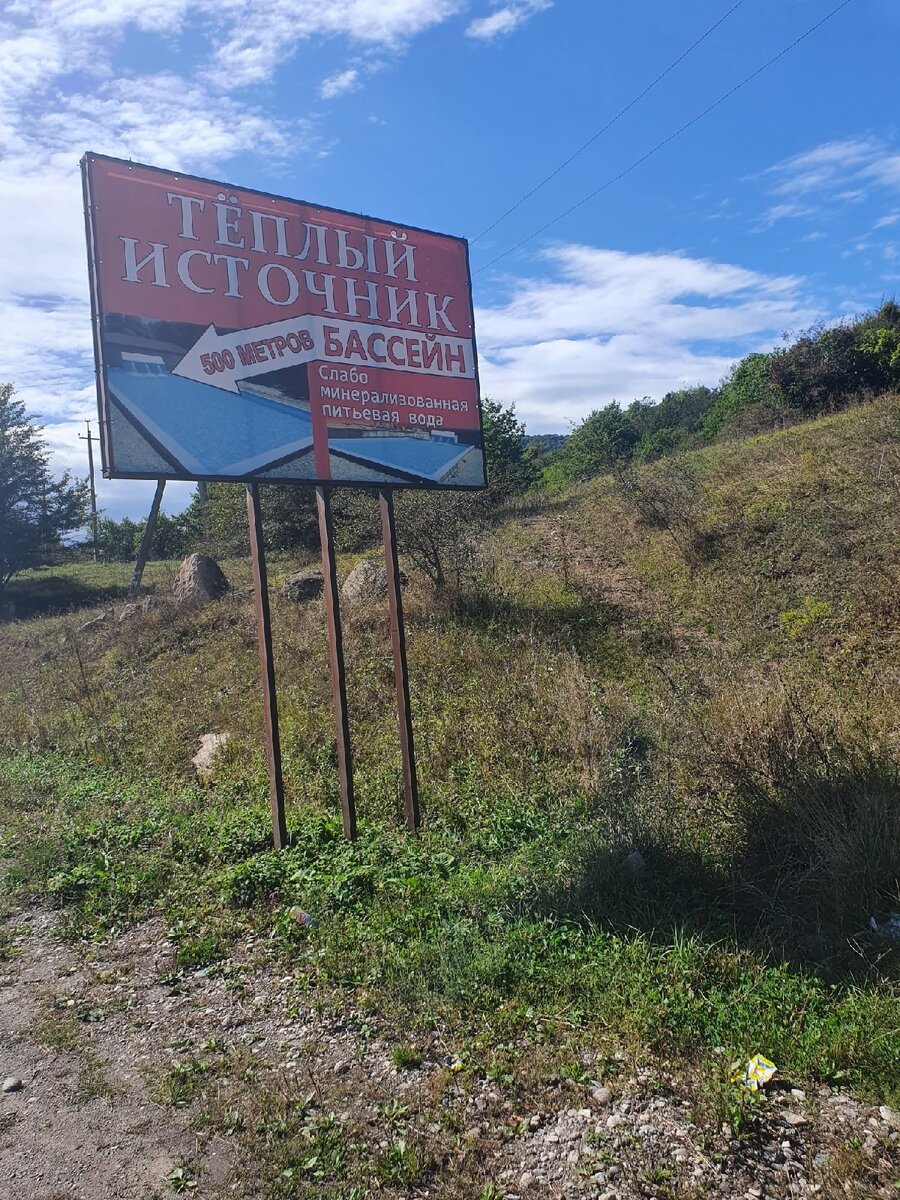 В самом начале пути после с. Лечинкай увидели вывеску "Теплый источник", спустились и чудо! отличный бассейн с теплой минеральной тёплой водой, бьющей из скважины глубиной 802 м (в 1966 г. пытались найти нефть, а нашли только воду), искупавшись за 150р. и наполнив бутылки природной минералкой двигаемся дальше.