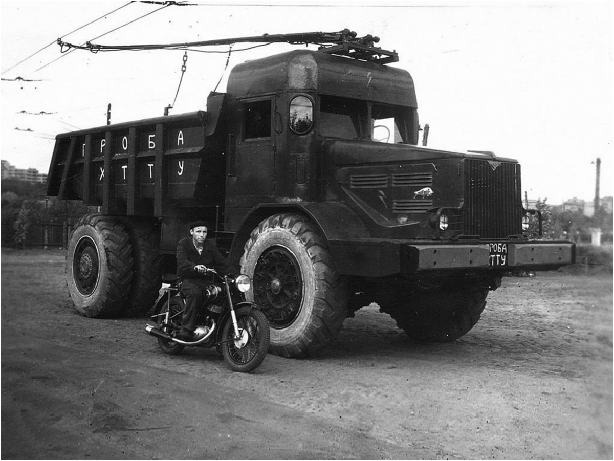 МАЗ-525 был родоначальником советской школы постройки самосвалов-гигантов и производился до конца 70-х годов. Эта машина обладала неисчислимым количеством плюсов, но был у неё и один существенный минус, который едва ли не перекрыл их. Этим недостатком был немыслимый расход топлива, который серьёзно усложнял работу на этом самосвале. И дело было не столько в выгоде, сколько в неудобстве, даже огромные топливные баки не спасали ситуацию и самосвал требовал постоянной дозаправки. В попытке решить эту проблему инженеры принялись за разработку проекта по электрификации МАЗ-525. Проект МАЗ-525ХТТУ, являлся чем-то вроде троллейбуса на грузовом шасси, а такие машины было принято называть троллейвозами. Над проектом работали инженеры завода МАЗ, Института горного дела АН УССР и Харьковского троллейбусного депо. Результатом слаженной работы предприятий в 1954 году свет увидел первый ходовой образец электрифицированного самосвала. В те годы в Советском Союзе не было электродвигателя с необходи