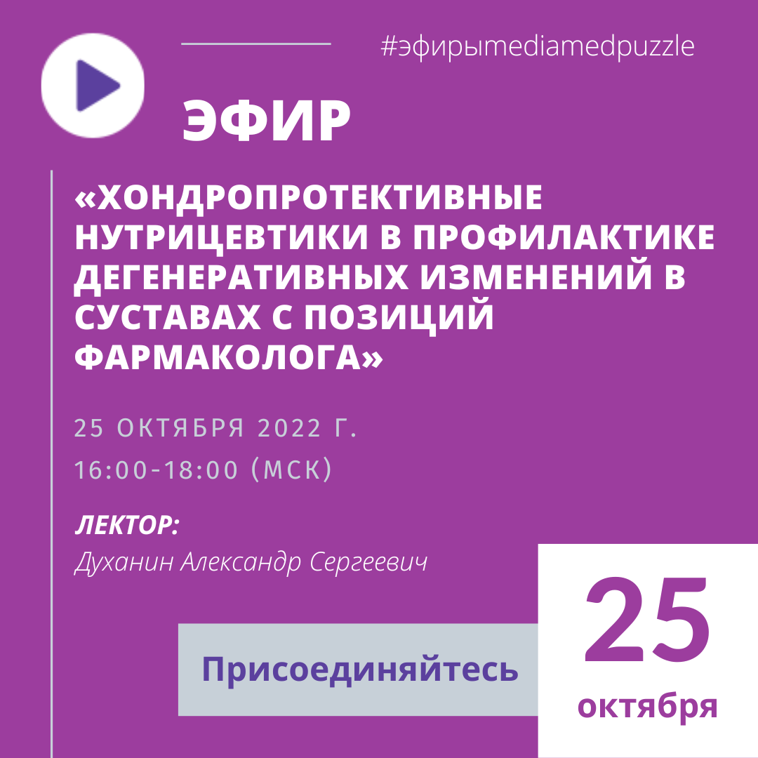 Уважаемые коллеги, приглашаем вас принять участие в вебинаре «Хондропротективные нутрицевтики в профилактике дегенеративных изменений в суставах c позиций фармаколога» Дата: 25.10.2022 г.