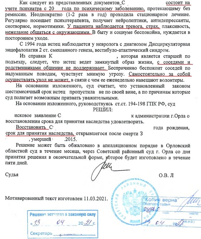 Приведу цитаты из решения суда по одному из дел, где я представлял интересы ответчика, к которому был предъявлен иск о восстановлении срока принятия наследства: