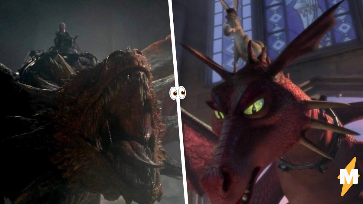 Зрители сравнили сериал "Дом Дракона" и культовый мультфильм "Шрек" и обнаружили сходства. Кадры с драконами, наряды героев сцены с семейными пиршествами кажутся на скриншотах копиями друг друга. Тиктокер с никнеймом @byramirezz заметил, что сериал "Дом Дракона" визуально напоминает мультфильм "Шрек". Пользователь приложения сравнил шоу, и оказалось, что некоторые кадры кажутся точными копиями друг друга. Например, вторая жена короля Визериса Таргариена Алисента Хайтауэр в зелёном платье и золотых украшениях похожа на принцессу Фиону. Сцена, в которой осёл из "Шрека" седлает красного дракона, по композиции и цветовой гамме напоминает кадр с Рейнис Таргариен. В "Доме Дракона" Таргариены устраивают семейный ужин в тёмном зале при свете факелов и свечей. Как и в "Шреке", трапеза заканчивается ссорой и потасовкой. Сходство "Шрека" и "Дома Дракона" подчёркивают и маленькие детали. Например, на столе у Таргариенов рядом с Эймондом стоит точно такое же блюдо, что и в "Шреке". Это запечённая ц