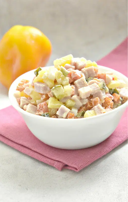 Вкусный и простой в приготовлении салат с ветчиной удачно впишется в ваше меню – и в праздничное, и в будничное. Чтобы приготовить салат с ветчиной и перцем, заранее нужно отварить картофель, морковку и яйца. Данные ингредиенты после варки остудить под ледяной водой и очистить. Сладкий болгарский перец очищаем от семян, ополаскиваем. Для заправки используется майонез, но его можно заменить сметаной. Пошаговый рецепт Ингредиенты Начнем измельчение с ветчины. Нарезаем ее маленькими кусочками. Следом измельчаем подобным образом отварной картофель. На очереди – вареная морковка. Ее тоже нарезаем кубиками. Маринованный огурец и сладкий болгарский перец нарезаем аналогично – маленькими кубиками. Яйца рубим кусочками. Измельченные ингредиенты соединяем в миске, солим, перчим, заправляем майонезом или сметаной. Перемешиваем. Салат с ветчиной, сладким перцем и огурцами получился сытным и вкусным, угощайтесь. Приятного аппетита! Ещё больше интересных рецептов смотрите в нашей рубрике САЛАТЫ ИЗ Я