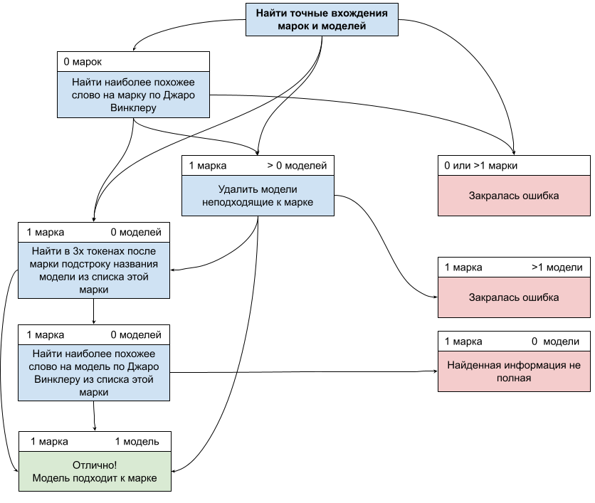 - поиск «подходящих» марок и моделей, используя меру схожести Джаро-Винклера (уровень допустимости регулируется внутри словаря марок, для каждого наименования отдельно);