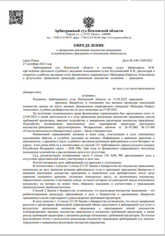 27.09.2022 г. в Арбитражном суде Пензенской области было принято решение завершить процедуру реализации имущества и освободить от дальнейшего исполнения требований кредиторов гражданина, обратившегося к нам за услугами по сопровождению в процедуре банкротства. Сумма списанного долга: 964 655 р. Поздравляем с успешным завершением нашего клиента! Обратиться за юридической помощью можно по номеру +7 (960)-328-01-38 Наш сайт: https://sm-pravo.ru/